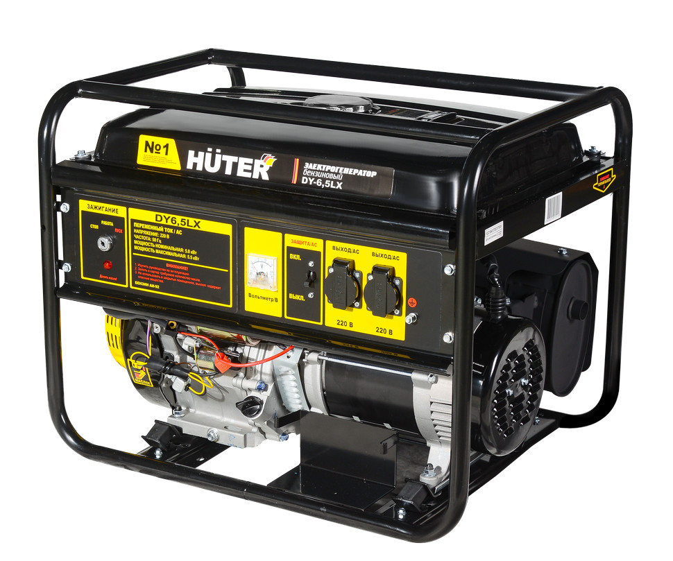 • Бензиновый генератор Huter DY6,5LX – портативная компактная электростанция, обеспечивающая электроснабжение бытовой техники и профессионального оборудования, питающегося от стандартной сети 220 Вольт. Это самый выгодный бензиновый электрогенератор, с оптимальными техническими характеристиками и низким расходом топлива.Модель DY6,5LX может использоваться в качестве резервного источника питания для частных домов и квартир, а также как постоянная станция, обеспечивающая работу электроприборов в полевых условиях. Генерирующая установка имеет синхронный тип устройства и щёточный механизм.Комплектация:Бензиновый электрогенератор.Силовая вилка 32 АСвечной ключ. Вороток либо отвёртка (в зависимости от модели)Провода и детали лотка аккумуляторной батареи (для моделей с X в названии)Комплект резиновых опор с гайкамиКлюч электростартера (для моделей с обозначением X)Паспорт (руководство по эксплуатации)Бензиновая электростанция Huter DY6,5LX оборудована мощным одноцилиндровым четырёхтактным двигателем внутреннего сгорания, мощностью 13 л.с. Запуск производится ручным стартером или электростартером от АКБ (*аккумулятор не входит в комплектацию и приобретается отдельно). Для удобства транспортировки, отдельно можно приобрести колёса и ручки. Электрогенератор DY6,5LX имеет рабочую мощность 5 кВт, а также все виды защиты – от перегрузки, короткого замыкания и низкого масляного уровня.