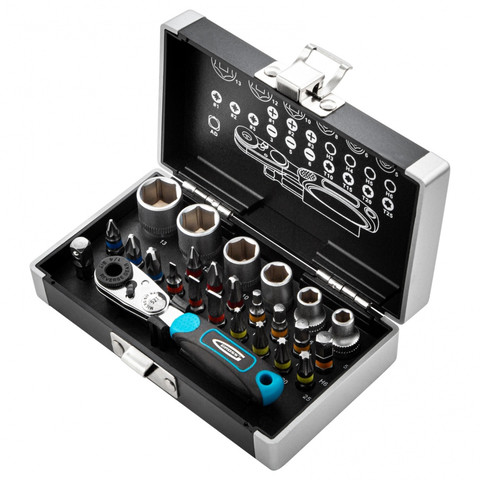 • Набор бит и торцевых головок Gross 11361 из стали S2, с посадочным размером 1/4 дюйма, с магнитным адаптером, в пластиковом кейсе, включает в себя 26 предметов для монтажа и демонтажа резьбовых соединений. Применяется при сборке мебели, электроприборов, велосипедов. В комплект входит 17 бит и 6 торцевых головок самых востребованных размеров, миниатюрный ключ-трещотка, удлинитель для бит и переходник с шестигранника на квадрат.ПреимуществаШирокая комплектация — набор включает биты Phillips калибров 1-3, Pozidriv калибров 1-3, прямой шлиц SL калибров 3, 5, 6, TORX 10, 15, 20, 25, HEX 3-6 и торцевые головки на 1/4 размерами 5, 6, 8, 10, 12, 13 мм.Высокий ресурс — биты из японской легированной стали S2 твердостью 52-54 HRC и торцевые головки из хромованадиевой стали твердостью 48 HRC обладают повышенной прочностью, износостойкостью и рассчитаны на долгую службу.Работа в труднодоступных местах — компактная трещотка с 52 зубьями особенно актуальна в ограниченном пространстве, где невозможно работать шуруповертом.Реверс — флажковый переключатель позволяет осуществлять трещоткой демонтаж резьбовых соединений.Магнитный адаптер в комплекте — насадки надежно удерживаются, что позволяет выполнять работы в труднодоступных местах.Комфортная работа — прорезиненный корпус трещотки обеспечивает удобный захват инструмента.Бережное хранение и удобная транспортировка — набор поставляется в ударопрочном пластиковом кейсе с надежным замком.Быстрый поиск нужной насадки — состав набора отражен на крышке кейса.