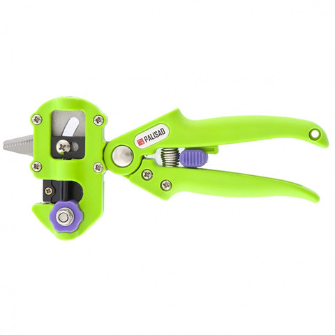 • Прививочный секатор Palisad 60502 длиной 215 мм, со сменными ножами, используется для прививки плодовых растений черенком. Фигурные ножи секатора изготовлены из рессорно-пружинной стали, поэтому обладают высоким ресурсом (рассчитаны на 5000 срезов без дополнительной заточки). В комплекте U-образный, V-бразный и Ω-образный ножи, что позволяет работать с черенками различной толщины и плотности. Вырезы, сделанные на подвое и привое, идеально совместимы друг с другом, дополнительная подгонка им не требуется.ПреимуществаЛезвия изготовлены из нержавеющей стали, поэтому не боятся коррозии.Режущая кромка с прецизионной заточкой производит качественный рез и продлевает ресурс инструмента.При помощи винта можно отрегулировать плотность смыкания лезвий, вернув секатору работоспособность в случае ухудшения качества реза.Фиксатор надежно удерживает лезвия в нерабочем положении, поэтому инструмент безопасен в хранении и транспортировке.Прививочные ножи покрыты порошковой эмалью, что защищает их от ржавчины.Каждый фигурный нож рассчитан на 5000 срезов, поэтому инструмент долго не требует заточки.Рукоятки выполнены из полиамида, поэтому они устойчивы к воздействию ультрафиолета, а также выдерживают значительные нагрузки.