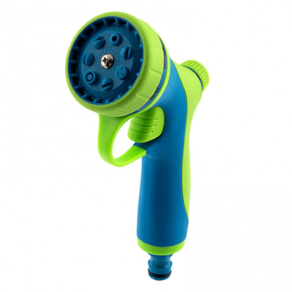 • Пластиковый пистолет-распылитель Palisad LUXE 65163 с 7 режимами полива применяется для быстрого и качественного орошения клумб и грядок, очищения садовых дорожек и т.д. Он пригодится дачникам и работникам коммунальных служб для обслуживания придомовых территорий, небольших скверов и парков. Универсальный пистолет можно установить на любую систему полива ТМ Palisad.ПреимуществаДоступны 7 режимов работы: подача жесткой, двойной плоско-вертикальной или двойной плоско-горизонтальной струи, сочащийся режим, душ, распыление типа «туман» или конусное.Рабочая часть легко поворачивается, это позволяет быстро переключаться между режимами подачи воды, ориентируясь на тип и хрупкость растений.Корпус выполнен из прорезиненного ABS-пластика — легкого и прочного материала, устойчивого к атмосферным воздействиям.Благодаря специальному фиксатору можно организовать непрерывный полив, что обеспечивает комфортную работу.Встроенный быстросъемный коннектор с аквастопом предотвращает подачу воды после отключения пистолета от шланга.Курок расположен спереди, что повышает удобство эксплуатации пистолета-распылителя.Рукоятка эргономичной формы надежно ложится в руку и не проскальзывает.